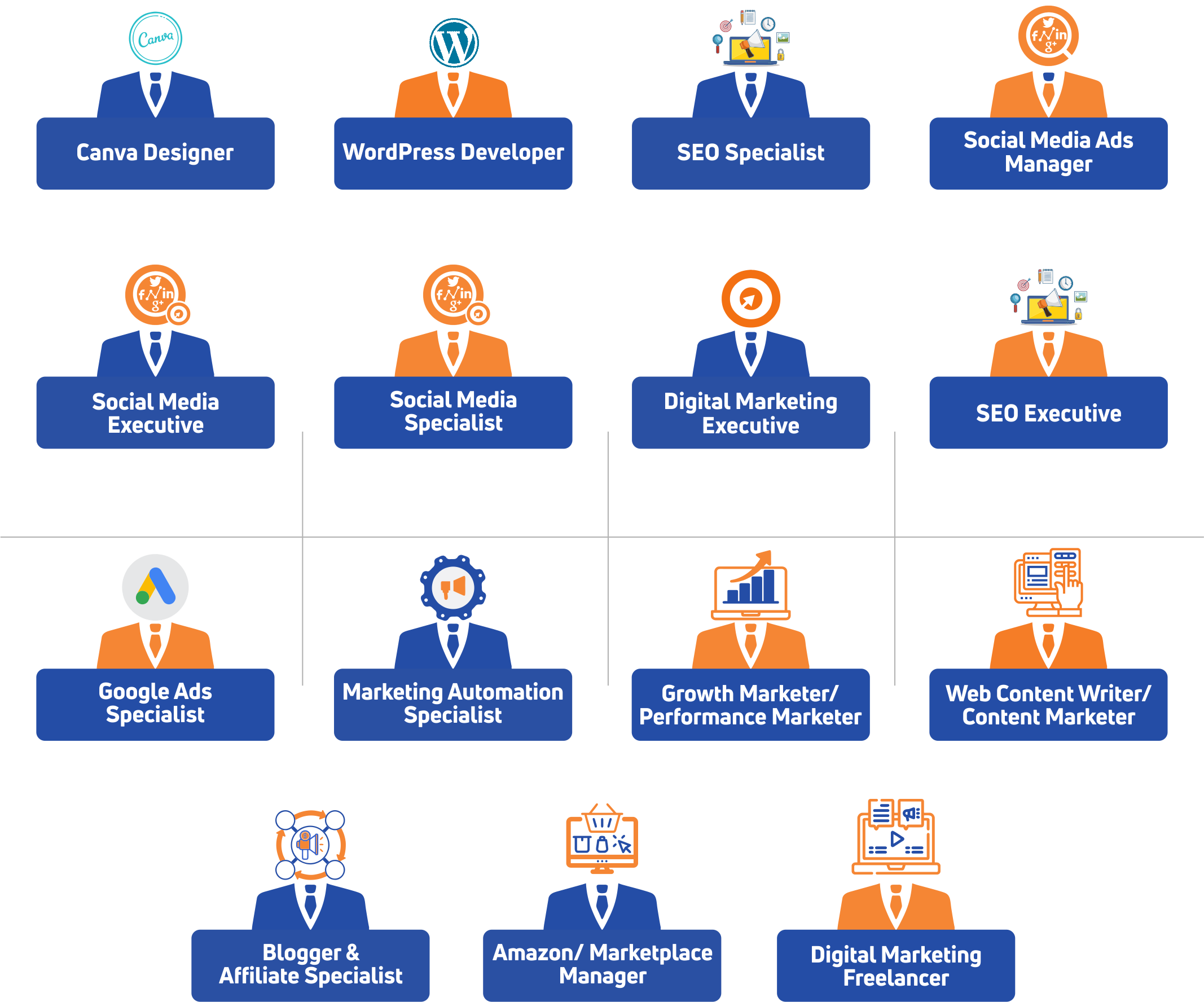 Digiperform’s Digital Marketing Master Program is India’s Leading Digital Marketing All-In-One Digital Skills Program that covers 25 Core Specialization Skills including, Social, SEO, SEM, Content, Website , Web Graphics , Marketing Automation Along with emphasis on working as a freelancer and adding online income as an blogger or affiliate marketer. This program also covers best AI tools to usage to increase your productivity